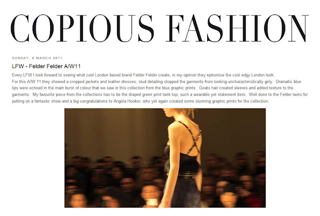 CLICK HERE TO SEE THE FULL REVIEW: Copious Fashion: LFW - Felder Felder A/W11: "Every LFW I look forward to seeing what cool London based brand Felder Felder create, in my opinion they epitomise the cool edgy London look..."